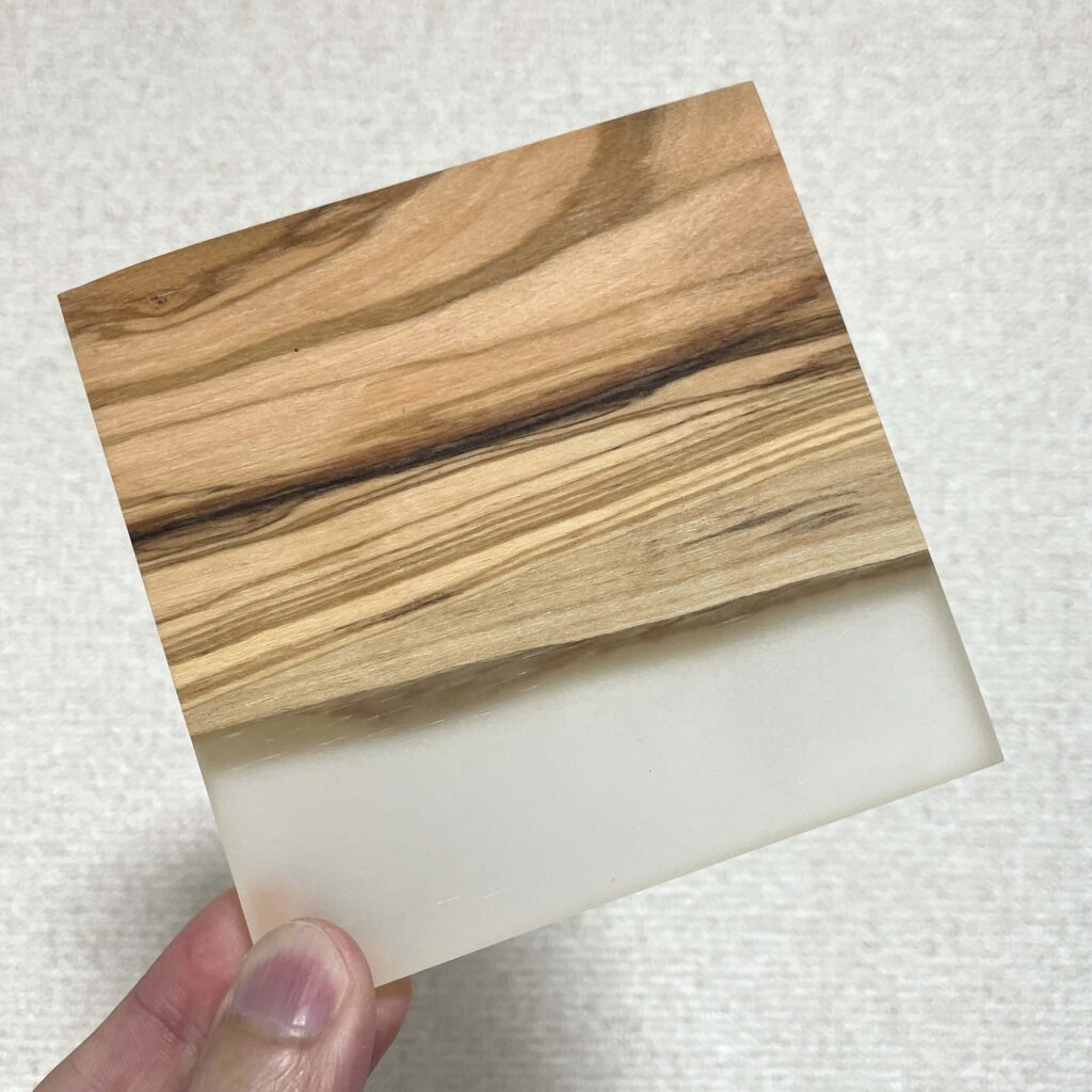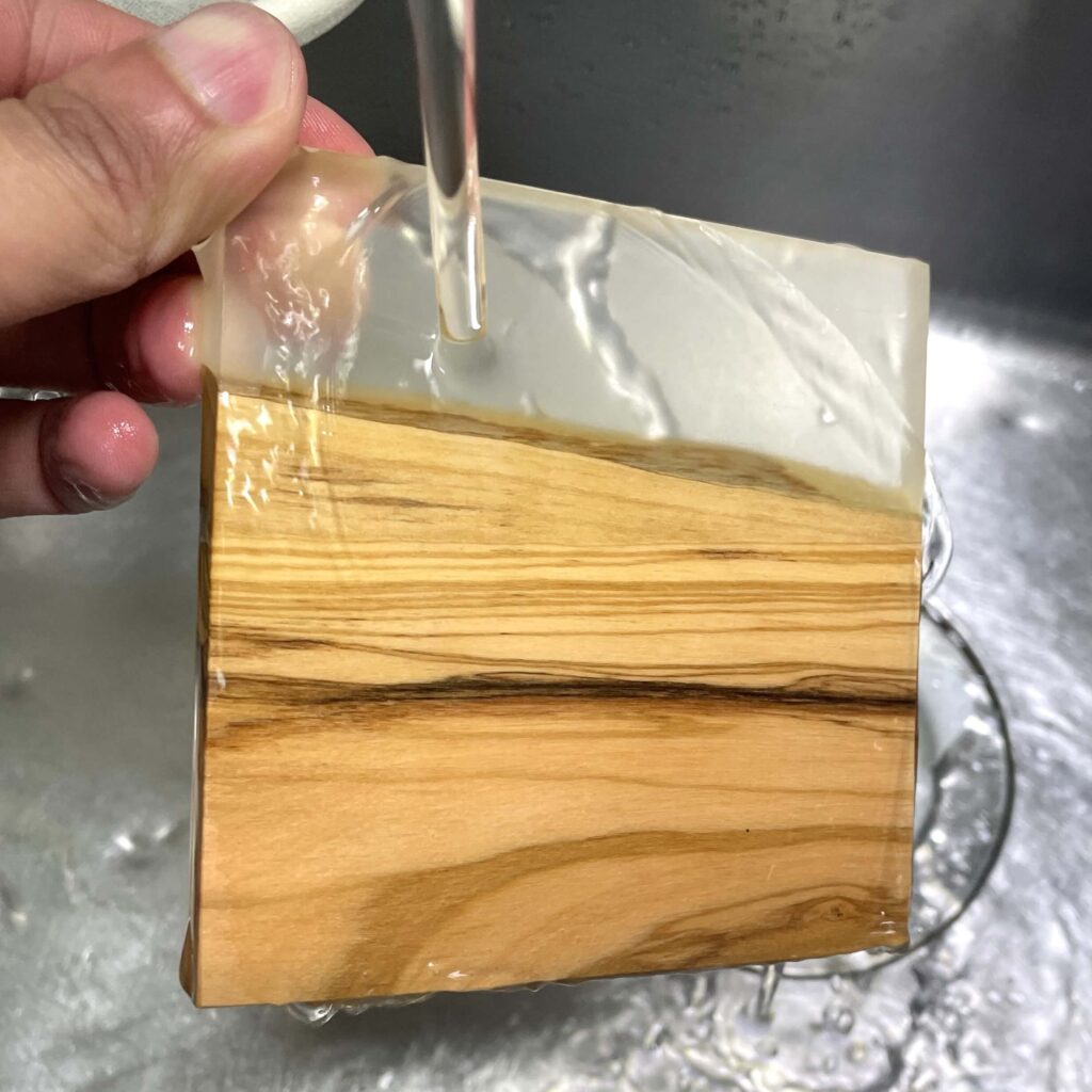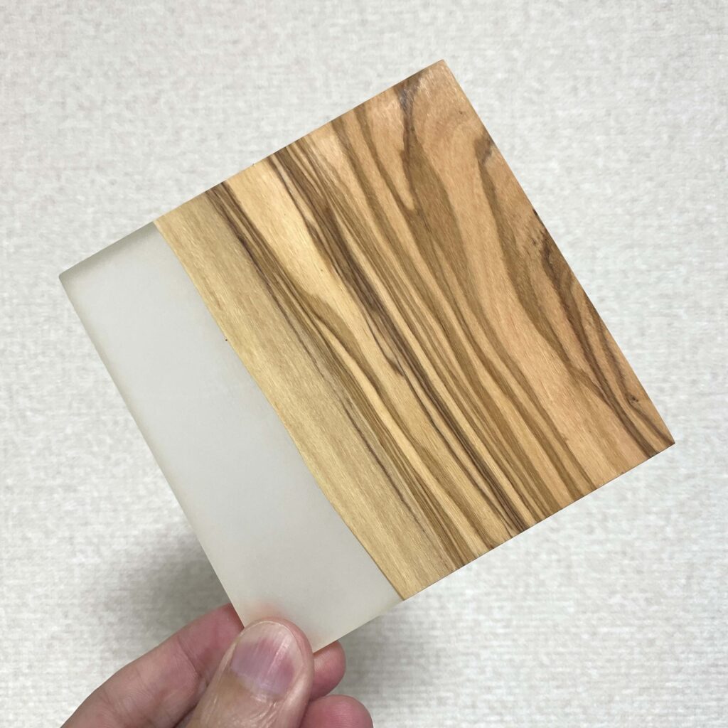 このように、オリーブウッドと樹脂を組み合わせたコースターになっています。