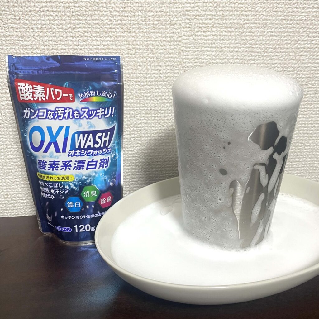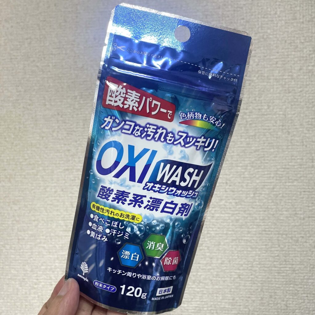 今回汚れ落としに使うのは、100円ショップ(ダイソーなど)で購入できる「OXI WASH(オキシウォッシュ)」という酸素系漂白剤です。